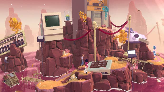 There is no dialogue in The Gardens Between, only vignettes of memories that you catch a glimpse of after completing a level. The islands hold things from the memory you're working towards, like discarded video game controllers, keyboards, fossils, obsolete technology, and so on. In one level, you use the numeric section of a keyboard to punch in a code that's visible elsewhere in the level, but you have to be careful in entering it because your two heroes always jump on the same two numbers when they hop across it, so utilizing the rewind and fastforward is essential to calculate the right output and unlock the puzzle's next step.